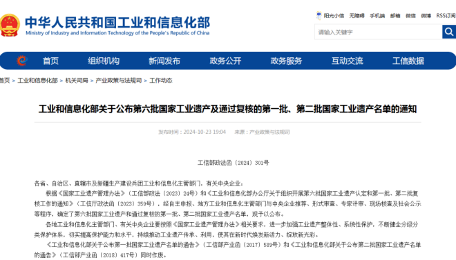 10月23日,中華人民共和國工業和信息化部發布了《工業和信息化部關於公布第六批國家工業遺產及通過複核的第一批、第二批國家工業遺產名單的通知》(以下簡稱“通知”)。