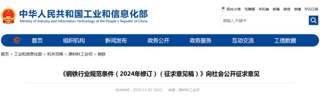 11月1日,工業和信息化部發布了《鋼鐵行業規範條件(2024年修訂)(征求意見稿)》,向社會公開征求意見。