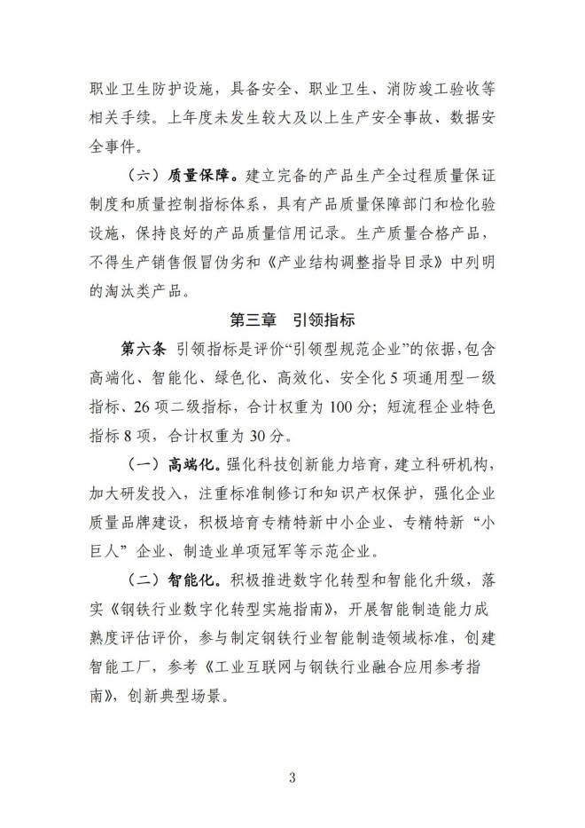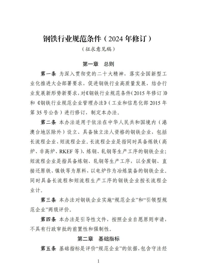 為落實全國新型工業化推進大會部署,加快推動鋼鐵行業轉型升級,依據國家有關法律法規和產業政策,我們對《鋼鐵行業規範條件(2015年修訂)》和《鋼鐵行業規範企業管理辦法》(工業和信息化部2015年第35號公告)進行了修訂,研究形成了《鋼鐵行業規範條件(2024年修訂)(征求意見稿)》(見附件),現向社會公開征求意見。如有修改意見或建議,請於11月14日前書麵反饋我司。