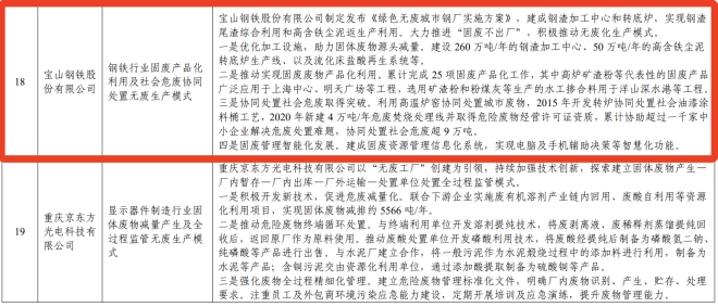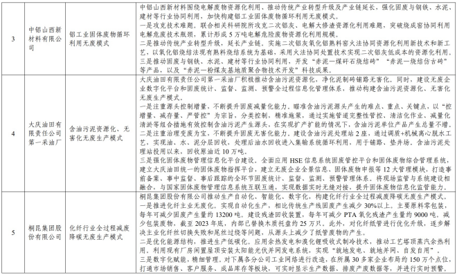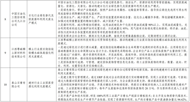 公告中表示:為落實《“十四五”工業綠色發展規劃》《“十四五”時期“無廢城市”建設工作方案》,引導工業園區、工業企業推行無廢生產方式,提高資源利用效率,實現工業固廢源頭減量和就地就近資源化利用,工業和信息化部、生態環境部兩部門征集了一批“無廢園區”“無廢企業”典型案例,共包括9個“無廢園區”、19個“無廢企業”典型案例。
