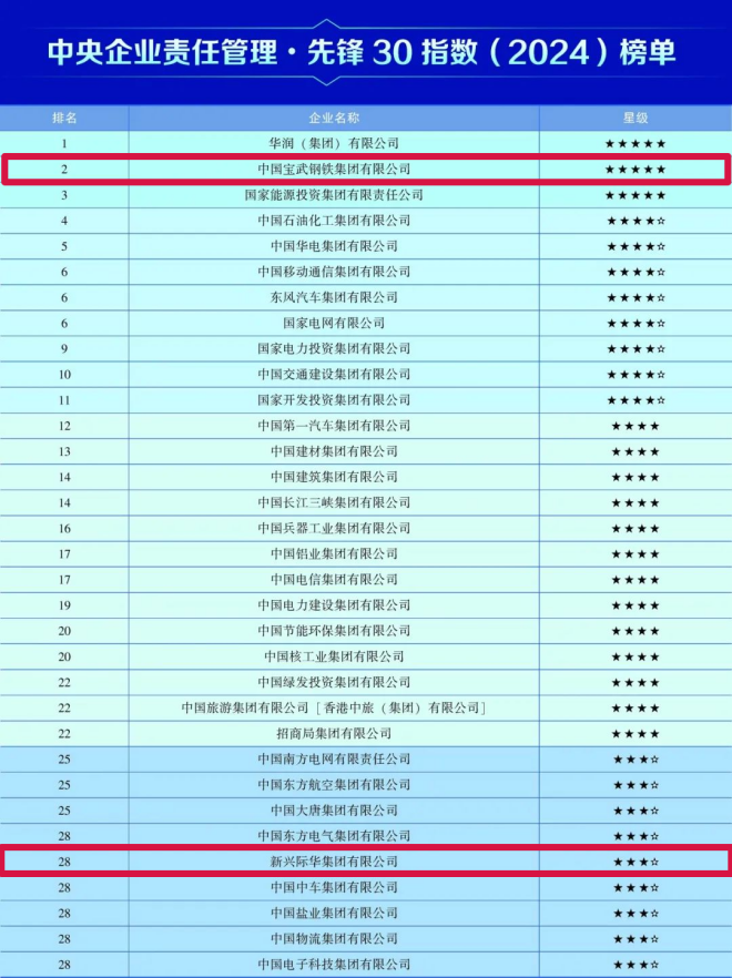 “中央企業責任管理·先鋒30指數(2024)”以100家中央企業(含中國鐵塔股份有限公司、中國汽車技術研究中心有限公司、中國綠發投資集團有限公司)為評價對象,依據國務院國資委最新發布的《指導意見》中對中央企業社會責任管理的有關要求,構建中央企業責任管理“六位一體”評價模型,基於央企責任管理公開信息搜集以及權威媒體新聞報道等,對中央企業在組織領導、製度機製、履責實踐、溝通傳播、監督考核、ESG工作等方麵的建設情況進行綜合評價,評選出表現最優的華潤集團、中國寶武、國家能源集團、中國石化、中國華電等33家中央企業,為國務院國資委統籌推動中央企業社會責任工作提供重要參考。