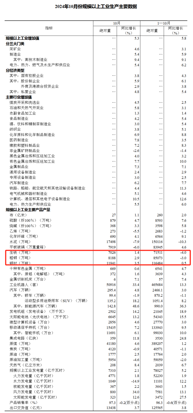 2024年10月份,我國鋼材產量11941萬噸,同比增長3.5%;1-10月份,我國鋼材產量116484萬噸,同比增長0.5%。