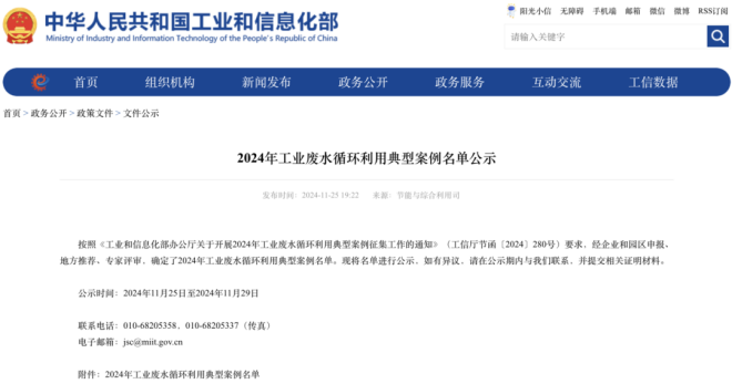 11月25日,工業和信息化部公示《2024年工業廢水循環利用典型案例名單》(以下簡稱《名單》)。