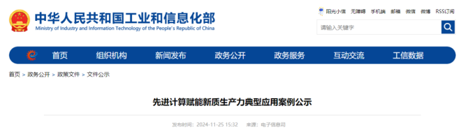 11月25日,中華人民共和國工業和信息化部網站發布了《先進計算賦能新質生產力典型應用案例公示》(以下簡稱《公示》)。