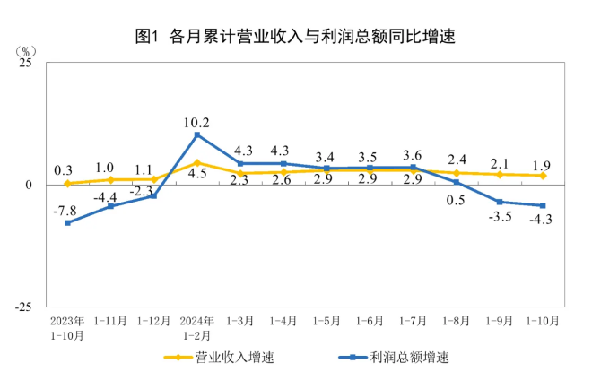 11月27日,國家統計局網站發布消息,1—10月份,全國規模以上工業企業實現利潤總額58680.4億元,同比下降4.3%。