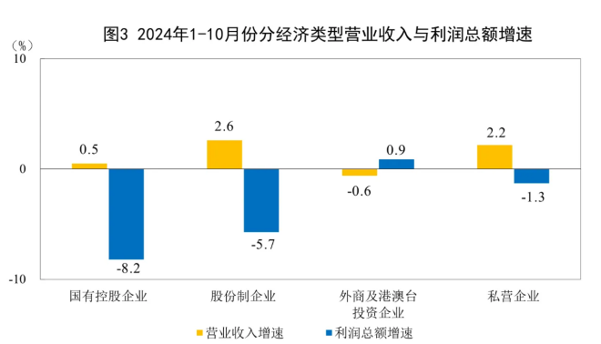 1—10月份,規模以上工業企業中,國有控股企業實現利潤總額18530.9億元,同比下降8.2%;股份製企業實現利潤總額43718.5億元,下降5.7%;外商及港澳台投資企業實現利潤總額14559.0億元,增長0.9%;私營企業實現利潤總額16501.7億元,下降1.3%。