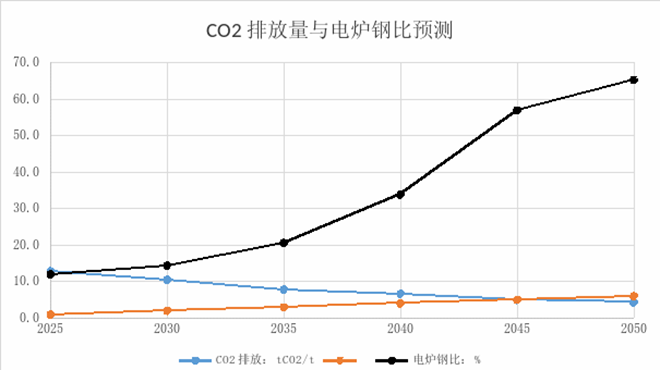 隨著社會Fe元素的積累,廢鋼循環量越來越大,電爐鋼比逐步增加。預測至2050年電爐鋼比將提高至65%左右,鋼鐵行業CO2排放將降低至5億噸左右,屆時電爐采用綠電冶煉,CO2排放將進一步降低。(魏新民 於國華)