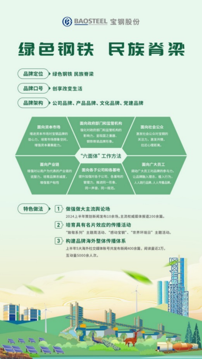 做大做強主流輿論場。借助中央電視台《經濟半小時》欄目,推出“傳統製造‘變形記’:當鋼鐵遇上大模型”“鋼鐵的新能源機會”深度報道,充分展示高質量發展成果;邀請中央媒體團50餘名記者集體探訪,集中點讚“寶鋼”品牌向高端化、智能化、綠色化的精彩蝶變,並形成新聞報道30餘篇,其中多篇報道閱讀量達100多萬;與新華社合作,創新以新媒體視角和語言製作《寶鋼到底有多“鋼”》,講述寶鋼股份綠色低碳、智慧製造成果,視頻一經推出瞬間引爆朋友圈,點擊量近百萬;jishigenzongbaoganggufengaigefazhandongtaiheshengchanjingyingdashijian,bingjieheyulunheshehuiguanzhuredian,wajuexinwenshijian,youjiezoucehuaxiliezhuantibaodao,xianggongzhongduojiaodu、全方位呈現寶鋼股份發展全貌。2024年至今,共策劃專題16個,主流權威媒體共發布新聞報道200餘篇。
