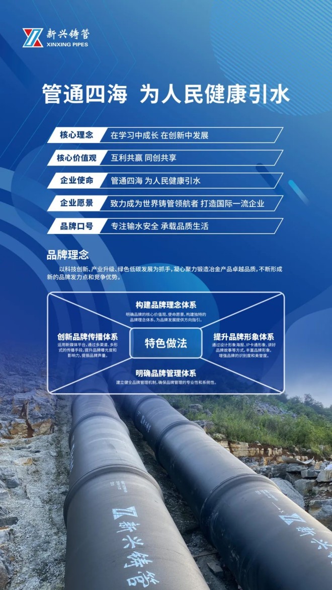 新興鑄管股份有限公司(以下簡稱“新興鑄管”)作為球墨鑄鐵管行業的領軍企業,綜合技術實力和生產規模位居世界首位,蟬聯冶金企業“競爭力極強A+”評級。作為中國球墨鑄鐵管行業的唯一代表,新興鑄管連續多年參加國際標準的製定和修訂。“新興”係列產品廣泛用於南水北調工程、長江三峽、大興國際機場、武漢雷神山和火神山醫院建設項目等,為國家大型水利工程、應急引水工程以及市政公共領域、熱力管網建設等作出了重大貢獻。“新興”品牌獲評中國馳名商標,連續九年入選亞洲品牌500強,排名穩步提升;先後獲得“中國綠色建材最具影響力品牌”“離心球墨鑄鐵管知名品牌”等榮譽。“飲用水安全保障技術體係創建與應用”獲得國家科學技術進步獎一等獎。