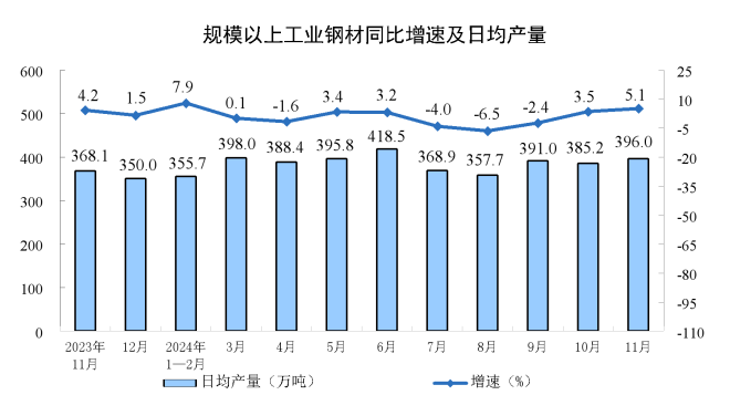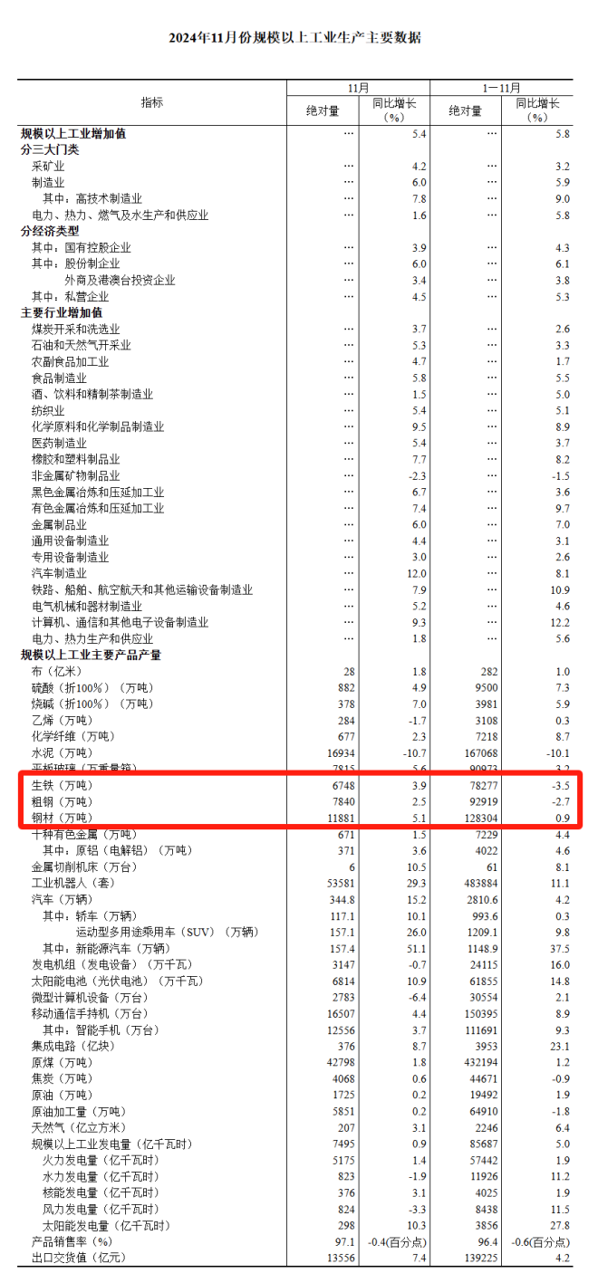 11月份鋼材產量為11881萬噸,同比增長5.1%;1-11月份鋼材產量為128304萬噸,同比上漲0.9%。