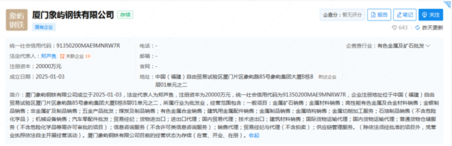 據企查查顯示,廈門象嶼鋼鐵有限公司於1月3日成立,法定代表人為鄭蘆魚,注冊資本為20000萬元。