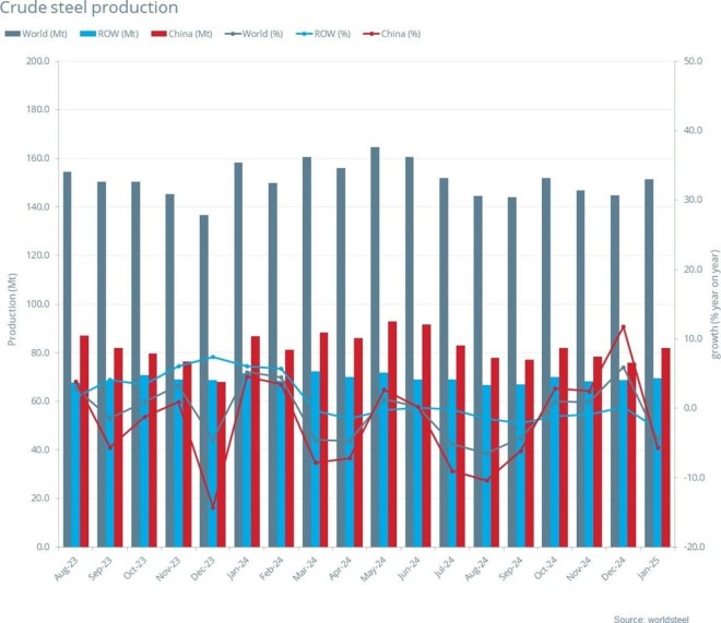2025年1月全球69個納入世界鋼鐵協會統計國家/地區的粗鋼產量為1.514億噸,同比下降4.4%。