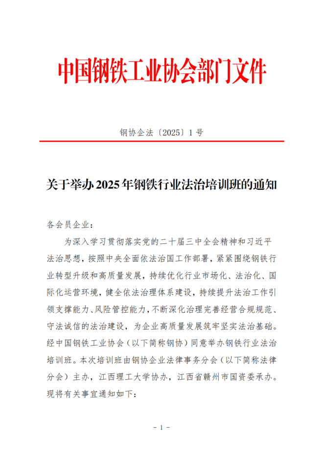 關於舉辦2025年鋼鐵行業法治培訓班的通知