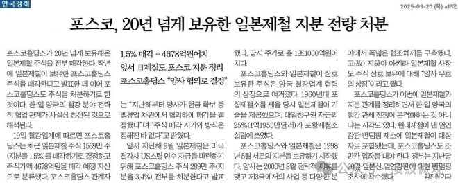 浦項將出售全部日本製鐵的股權