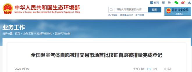 生態環境部:首批核證自願減排量完成登記
