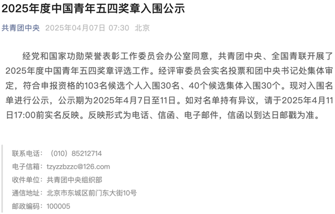 4月7日,公眾號共青團中央發布《2025年度中國青年五四獎章入圍公示》。