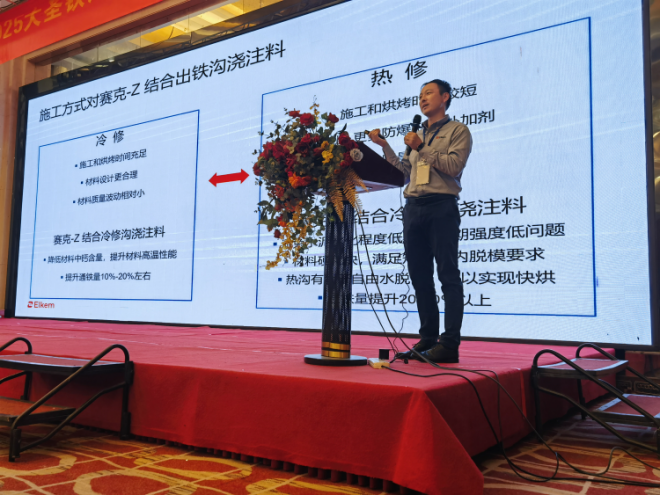 埃肯國際貿易(上海)技術經理戴長浩在《微矽粉及無水泥結合劑在出鐵溝澆注料中的應用》報告中,闡述新型材料在出鐵溝澆注料中的應用優勢。
