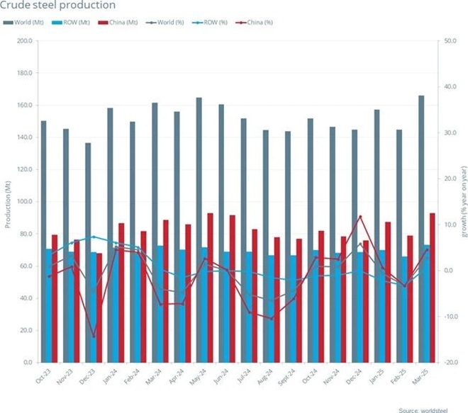 2025年3月全球粗鋼產量同比提高2.9%