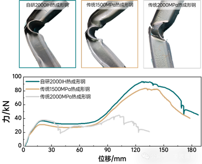 2000IH熱成形鋼,采用低碳+多元元素配比調控,引入有限的微合金化元素,結合富碳化物元素,形成多尺度析出物,在保持傳統2000MPa級熱成形鋼超高強度的同時,實現韌性和抗氫脆延遲開裂性能的顯著提升。這一雙重優勢使得2000IH熱成形鋼在力學性能優異——高變形抗力、接近1500MPa級熱成形鋼的韌性。2000IH熱成形鋼的吸能能力相較於傳統2000MPa級材料提升了約78%,相較於1500MPa級材料則提升了約10%。