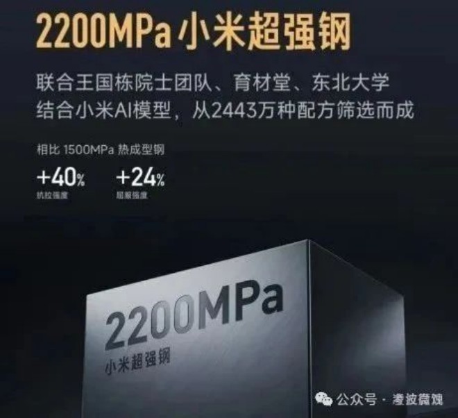 5月22日小米發布,2200MPa超強鋼,是目前強度最高的汽車鋼。相比1500MPa 熱成形鋼,抗拉強度提高40%,A柱承載提高25%,B柱承載提高70.5%,2200MPa超強鋼使用在全車四門防撞梁上,能提升側麵碰撞中的乘員艙保護,前門防撞梁承載能力提升 52.4%,後門防撞梁承載能力提37.6%。