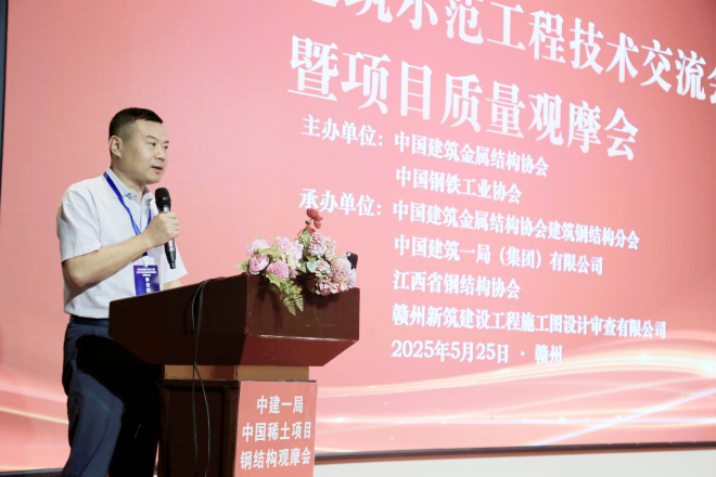 為深化鋼結構建築技術創新與產業協同,推動建築鋼結構行業高質量發展。由中國建築金屬結構協會、中國鋼鐵工業協會聯合主辦,中國建築金屬結構協會建築鋼結構分會、中國建築一局(集團)有限公司、江西省鋼結構協會、贛州新築建設工程施工圖設計審查有限公司聯合承辦的鋼結構建築示範工程建造技術交流會暨現場質量觀摩會議於2025年5月25日在江西贛州順利召開。來自行業協會、科研機構、高校及企業的專家代表、工程技術人員150餘人參加會議。
