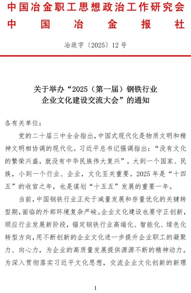 關於舉辦“2025(第一屆)鋼鐵行業企業文化建設交流大會”的通知
