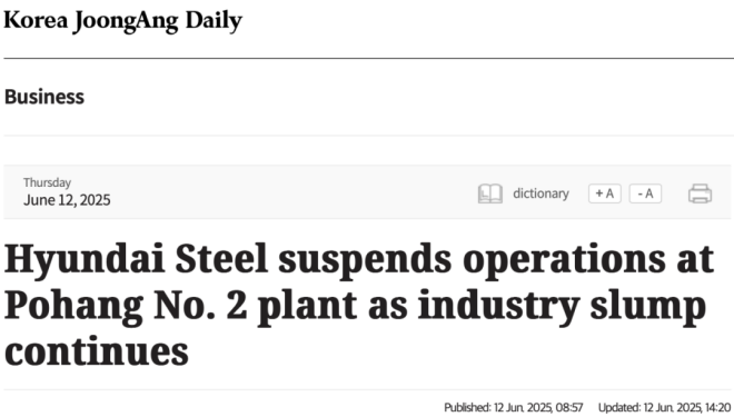 據韓國《中央日報》英文版《Korea JoongAng Daily》6月12日報道,韓國第二大鋼鐵生產商現代製鐵(Hyundai Steel)宣布,因行業長期低迷,已於6月7日暫時關閉了位於浦項的2號鋼廠。該公司發言人表示,關於關停鋼廠的未來決策將與工會協商後作出。