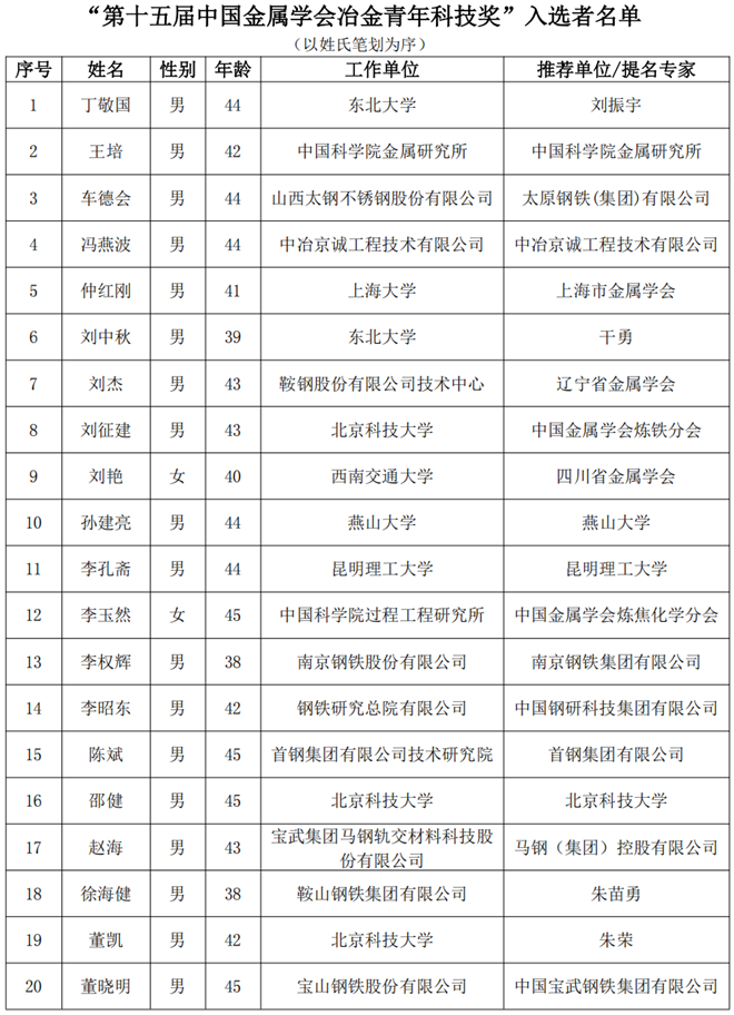 按照《中國金屬學會冶金青年科技獎獎勵章程》,第十五屆中國金屬學會冶金青年科技獎經單位推薦/專家提名、資格審查、初評、複評,最終有20名候選人入選。