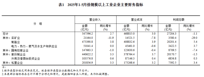 1-5月份,規模以上工業企業實現營業收入54.76萬億元,同比增長2.7%;發生營業成本46.88萬億元,增長3.0%;營業收入利潤率為4.97%,同比下降0.19個百分點。