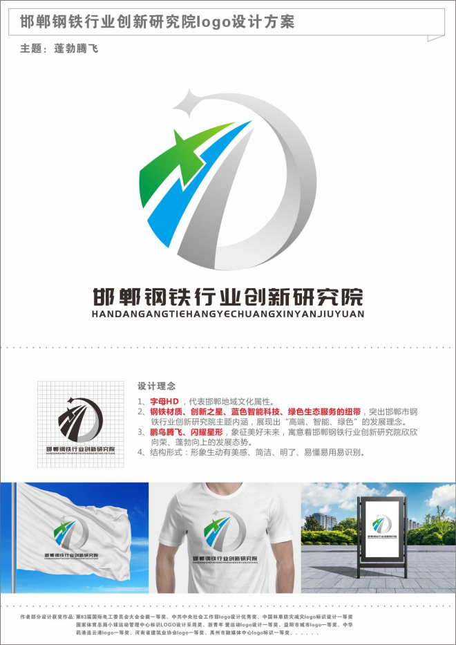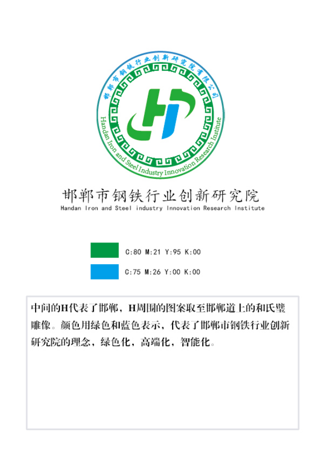 創意說明:中間的H代表古都邯鄲,H周(zhou)圍(wei)的(de)圖(tu)案(an)取(qu)自(zi)戰(zhan)國(guo)時(shi)期(qi)青(qing)銅(tong)器(qi)紋(wen)樣(yang)代(dai)表(biao)冶(ye)金(jin)曆(li)史(shi)悠(you)久(jiu)。顏(yan)色(se)用(yong)綠(lv)色(se)和(he)藍(lan)色(se)表(biao)示(shi),代(dai)表(biao)了(le)邯(han)鄲(dan)市(shi)鋼(gang)鐵(tie)行(xing)業(ye)創(chuang)新(xin)研(yan)究(jiu)院(yuan)的(de)理(li)念(nian),綠(lv)色(se)化(hua),高(gao)端(duan)化(hua),智(zhi)能(neng)化(hua)。