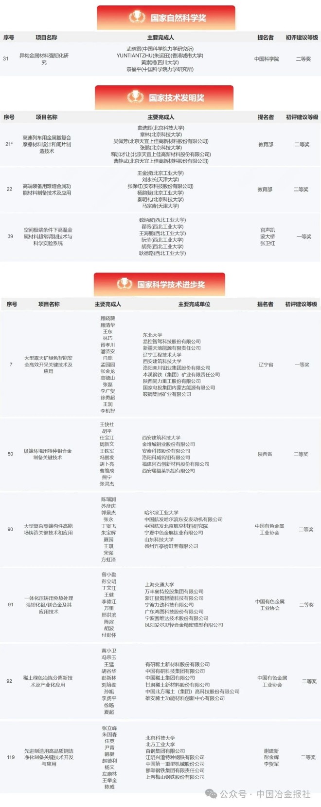 9月22日,科技部官網發布《國家科學技術獎勵工作辦公室公告第103號》。公告顯示,2025年度國家科學技術獎初評工作已經結束。現將通過初評的60項國家自然科學獎項目、51項國家技術發明獎通用項目、134項國家科學技術進步獎通用項目,在國家科技管理信息係統公共服務平台(https://service.most.gov.cn/jl)公示。其中,涉及鋼鐵相關領域的國家自然科學獎項目共1項、國家技術發明獎3獎、國家科學技術進步獎項目5項!
