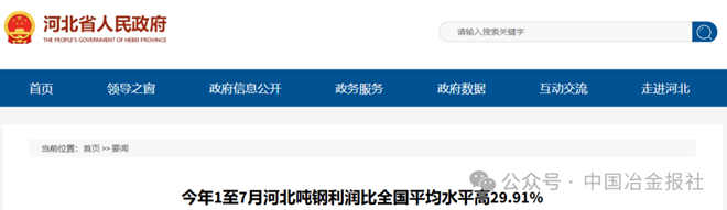 近日,河北省人民政府網站發布《今年1至7月河北噸鋼利潤比全國平均水平高29.91%》一文。