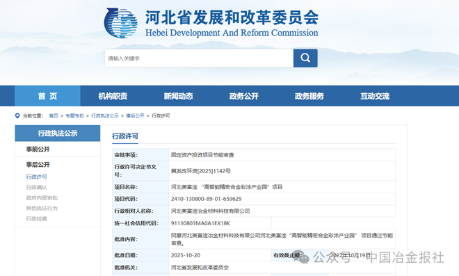 2025年10月20日,河北美富淦 “高智能精密合金彩塗產業園”項目,正式獲得河北省發展和改革委員會的節能審查批準。