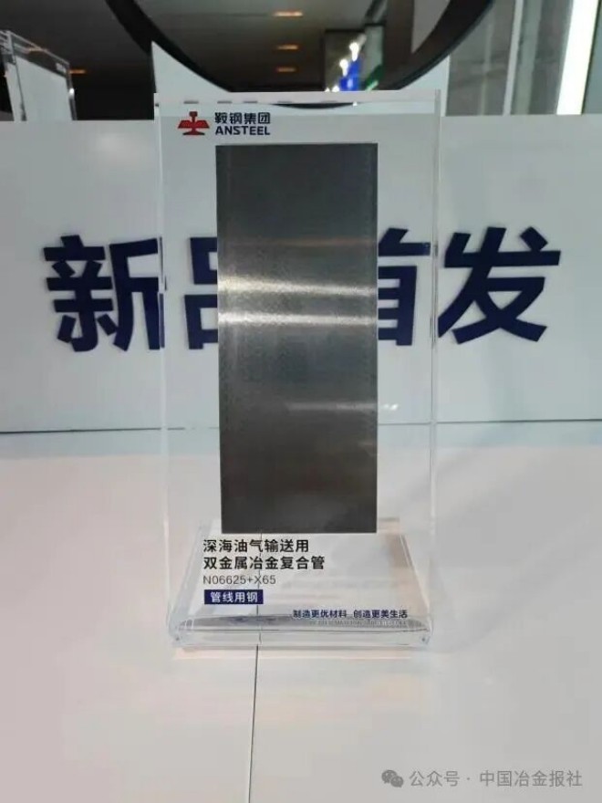 深海油氣輸送用雙金屬冶金複合管用鋼——N06625+X65:由鞍鋼集團牽頭聯合10餘家單位研發,依托工信部項目,采用X65管線鋼與N06625鎳基合金軋製複合製成。兼具基層高強韌性與覆層耐腐蝕性,經鋼研納克檢測達標,通過EPD環保認證。采用真空組坯及軋製複合技術,減少厚板開坯工序,經JCO成型製成大口徑複合管,填補國內空白。適配深海高腐蝕環境,為深海油氣資源開發築牢輸送“生命線”。