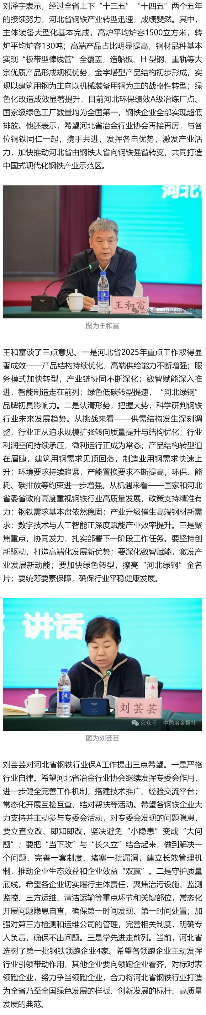 11月28日-29日,河北省冶金行業協會六屆二次理事會在河北石家莊召開。會議號召,站在“十四五”邁向“十五五”的曆史交彙點上,河北鋼鐵企業既要係統總結“十四五”發展經驗,又要前瞻性提早介入“十五五”規劃,將綠色基因、數字血脈、創新靈魂注入產業變革,書寫從“支柱”到“引領”的時代答卷,為譜寫中國式現代化建設河北篇章繼續作出鋼鐵新貢獻。