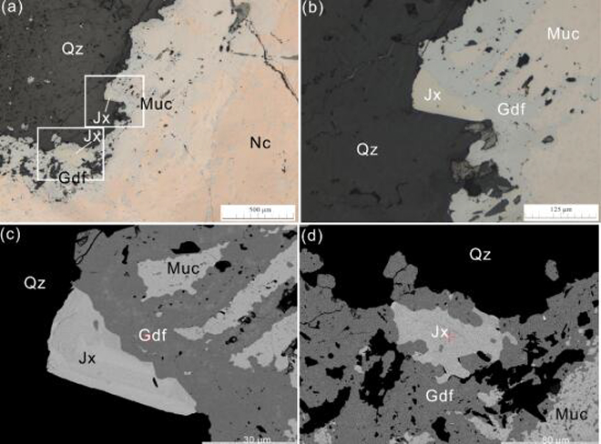 金秀礦(Jx)的反射光及背散射電子圖像;Nc-紅砷鎳礦;Muc-砷鎳礦;Gdf-輝砷鎳礦;Qz-石英