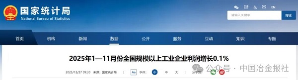 12月27日,國家統計局網站發布《2025年1—11月份全國規模以上工業企業利潤增長0.1%》一文。