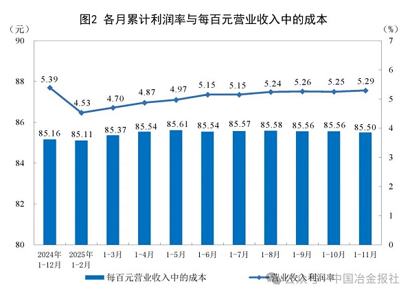1—11月份,規模以上工業企業實現營業收入125.34萬億元,同比增長1.6%;發生營業成本107.17萬億元,增長1.8%;營業收入利潤率為5.29%,同比下降0.08個百分點。