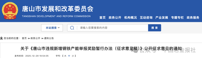 近日,唐山市發改委發布《唐山市違規新增鋼鐵產能舉報獎勵暫行辦法(征求意見稿)》,公開征求意見。
