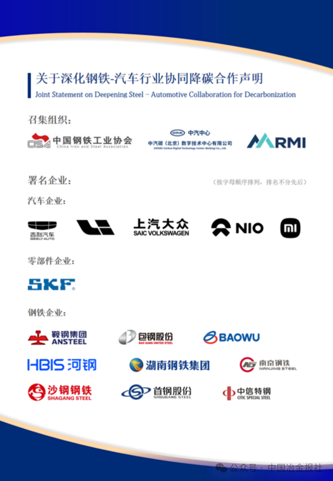 本次《合作聲明》由中鋼協、中汽中心(中汽碳)與落基山研究所共同召集發布。來自汽車企業的吉利汽車、理想汽車、上汽大眾、蔚來汽車、小米汽車,零部件企業斯凱孚,以及鋼鐵企業鞍鋼集團、包鋼股份、寶武集團、河鋼集團、湖南鋼鐵集團、南京鋼鐵、沙鋼鋼鐵、首鋼股份、中信泰富特鋼等加入了《合作聲明》(按字母順序排列,排名不分先後)。各方表示將以聲明為行動框架,持續推進標準協同、技術創新與產業合作,共同促進低碳排放鋼在汽車行業的規模化應用與市場化發展。