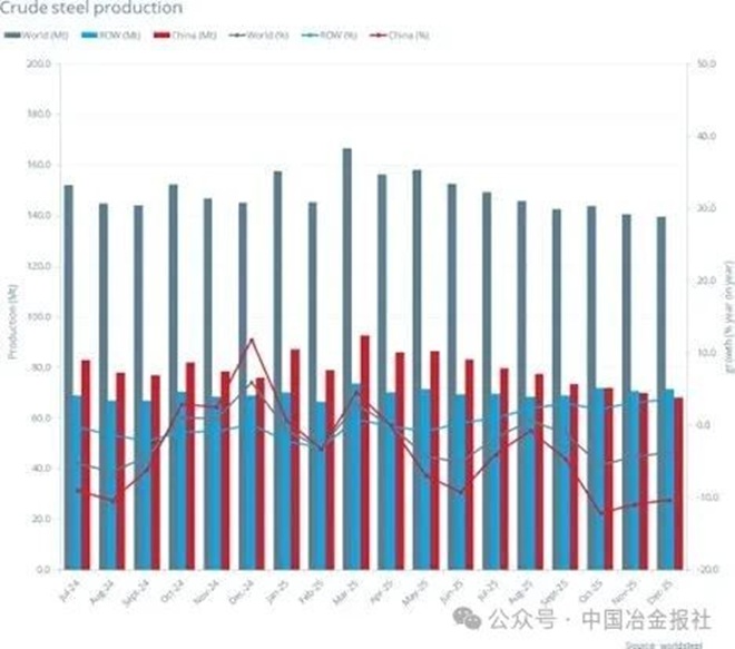 2025年12月全球70個納入世界鋼鐵協會統計國家/地區的粗鋼產量為1.396億噸,同比下降3.7%。