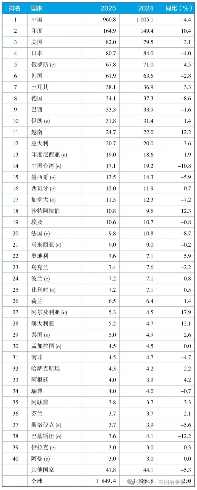 e - 預估值。排名依據為本年度累計粗鋼產量。