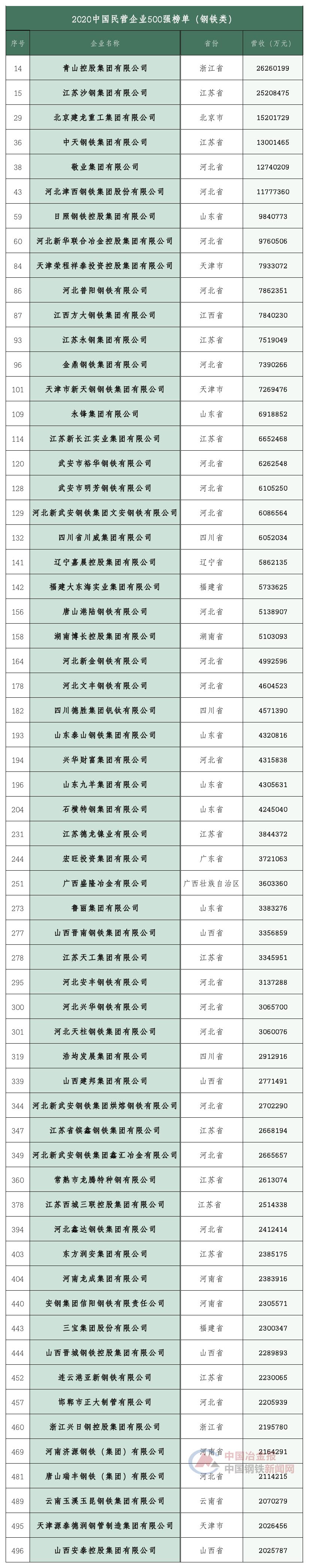 61家鋼企上榜2020中國民營企業500強!