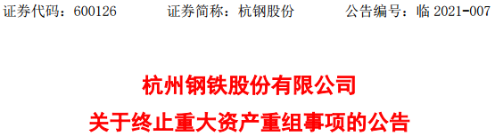 2021年2月7日,杭州鋼鐵股份有限公司召開第八屆董事會第八次會議,審議通過了《關於終止重大資產重組事項 並撤回相關申請材料的議案》, 同意杭鋼股份公司終止發行股份及支付現金購買資產暨關聯交易(以下簡稱“本次重組”或“本次交易”)事項及簽署本次交易的終止協議,並向中國證券監督管理委員會(以下簡稱“中國證監會”)申請撤回相關文件。