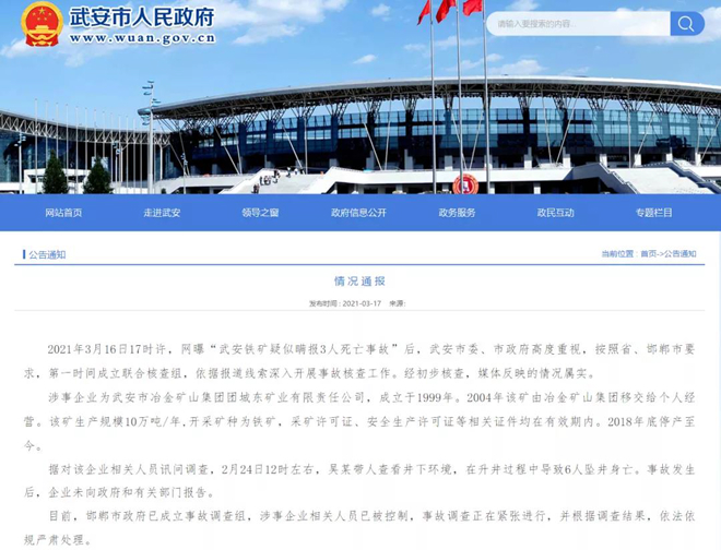 3月16日,網曝“武安鐵礦疑似瞞報3人死亡事故”。3月17日,河北省武安市人民政府發布對該事件的情況通報。通報顯示,經初步核查,媒體反映的情況屬實。