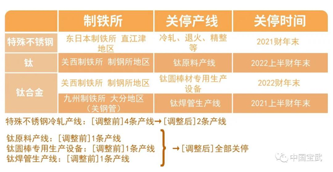 同時,為了提高鈦生產工藝效率,除了關停已經公布的關西製鐵所製鋼所地區鈦圓棒材專用生產設備、九州製鐵所大分地區(光鋼管)鈦焊管生產線外,還將關停關西製鐵所製鋼所地區的鈦原料產線。