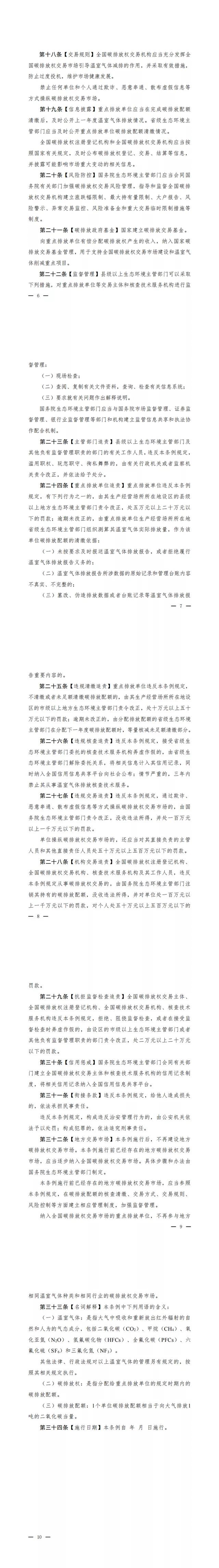 此外,重點排放單位違反條例相關規定時,由其生產經營場所所在地設區的縣級以上地方生態環境主管部門責令改正,處5萬元以上20萬元以下罰款;逾(yu)期(qi)未(wei)改(gai)正(zheng)的(de),由(you)重(zhong)點(dian)排(pai)放(fang)單(dan)位(wei)生(sheng)產(chan)經(jing)營(ying)場(chang)所(suo)所(suo)在(zai)地(di)省(sheng)級(ji)生(sheng)態(tai)環(huan)境(jing)主(zhu)管(guan)部(bu)門(men)組(zu)織(zhi)測(ce)算(suan)其(qi)溫(wen)室(shi)氣(qi)體(ti)實(shi)際(ji)排(pai)放(fang)量(liang),作(zuo)為(wei)該(gai)單(dan)位(wei)碳(tan)排(pai)放(fang)配(pei)額(e)的(de)清(qing)繳(jiao)依(yi)據(ju);通過欺詐、惡意串通、散布虛假信息等方式操縱碳排放權交易市場的,由國務院生態環境主管部門責令改正,沒收違法所得,並處100萬元以上1000萬元以下的罰款等。相關信用記錄納入全國信用信息共享平台。