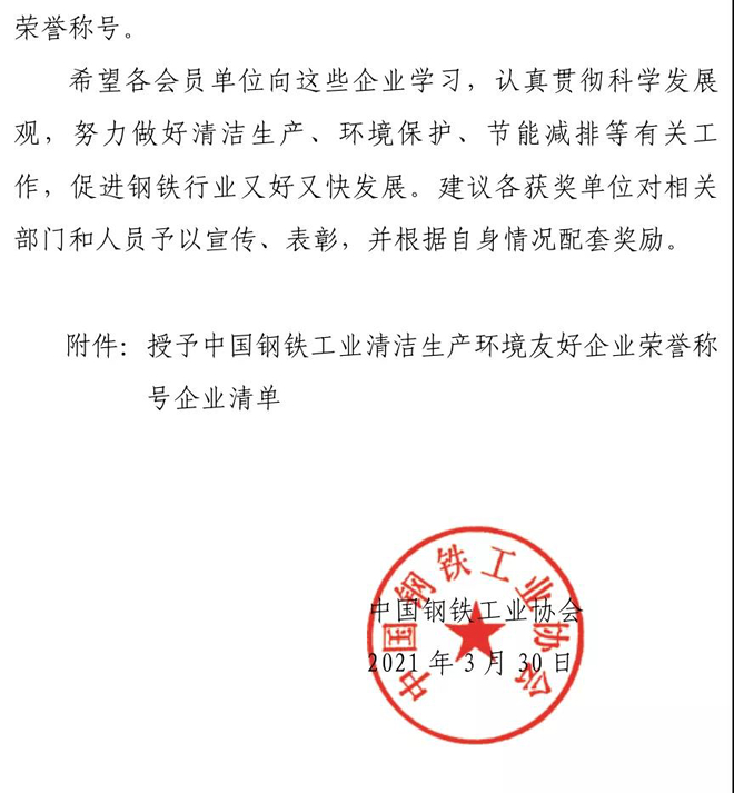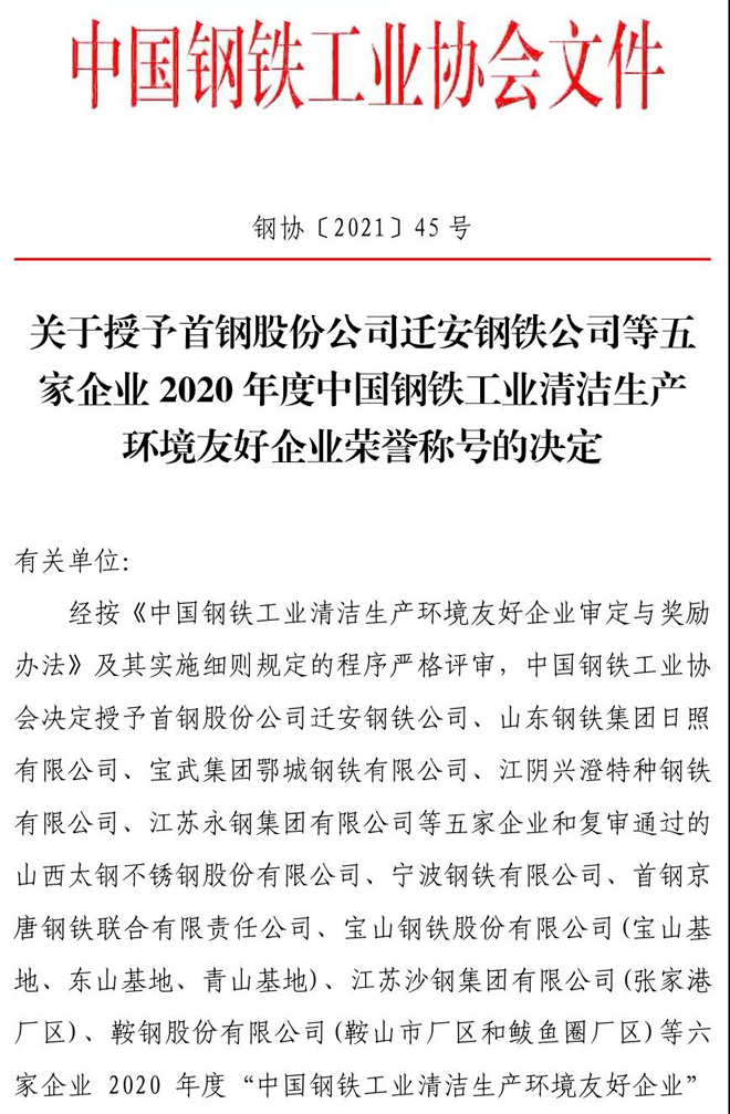 近日,中國鋼鐵工業協會發布《關於授予首鋼股份公司遷安鋼鐵公司等五家企業2020年度中國鋼鐵工業清潔生產環境友好企業榮譽稱號的決定》和《關於授予大冶特殊鋼有限公司大功率風電關鍵部件用高端軸承鋼等十項產品2020年度中國鋼鐵工業產品開發市場開拓獎的決定》。