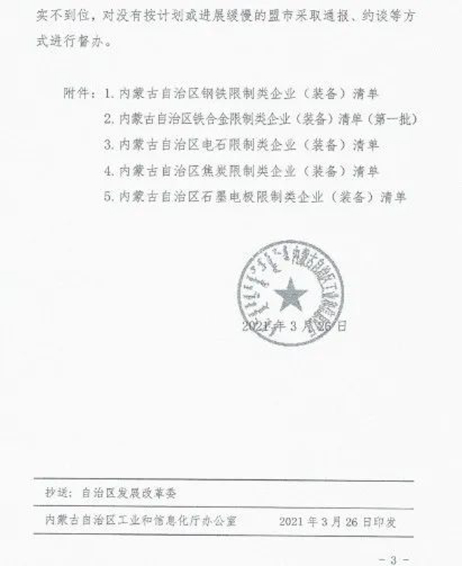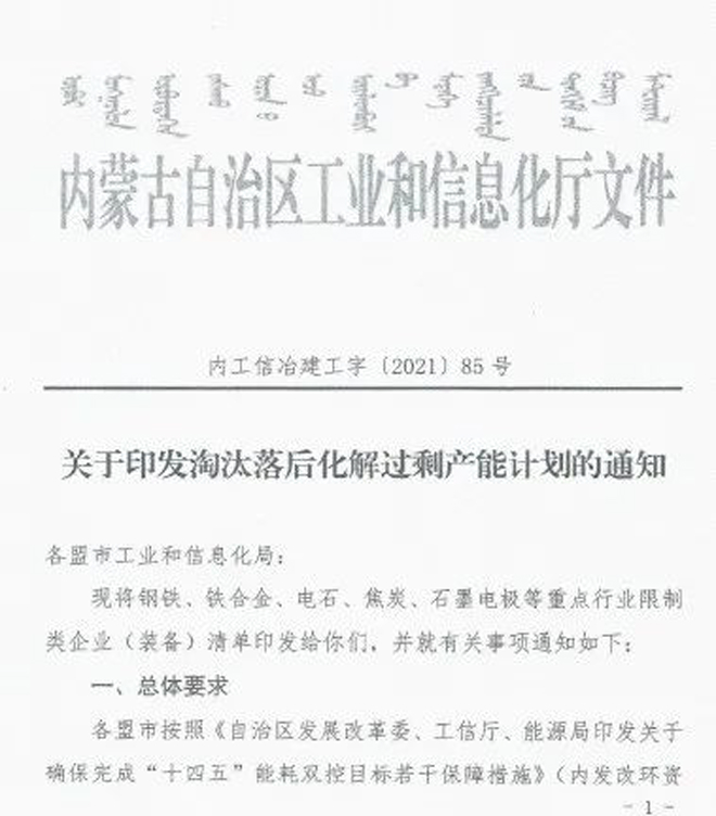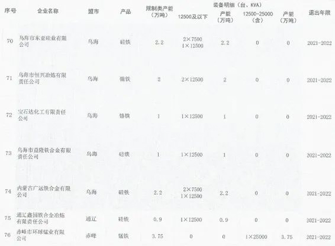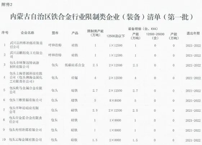 日前,內蒙古自治區工業和信息化廳印發《關於印發淘汰落後化解過剩產能計劃的通知》(以下簡稱《通知》),《通知》要求各盟市抓緊製定鐵合金、鋼鐵行業退出方案,明確2021~2023每一年度具體計劃,並要求整合退出的80%以上任務要安排在2021~2022年,整合工作要盡早開展,為產能退出創造條件。