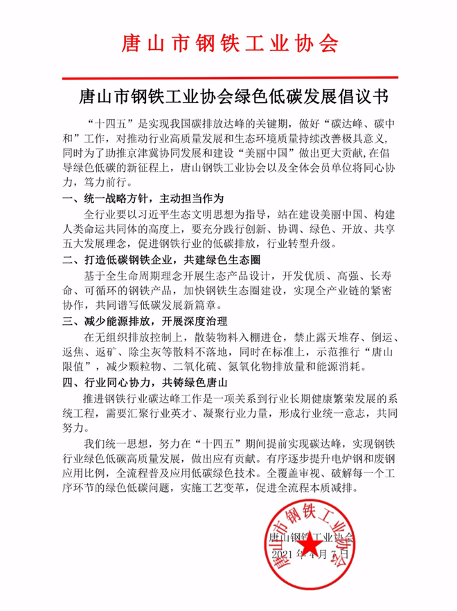 4月9日,《唐山市鋼鐵工業協會綠色低碳發展倡議書》(簡稱“《倡議書》”)發布。